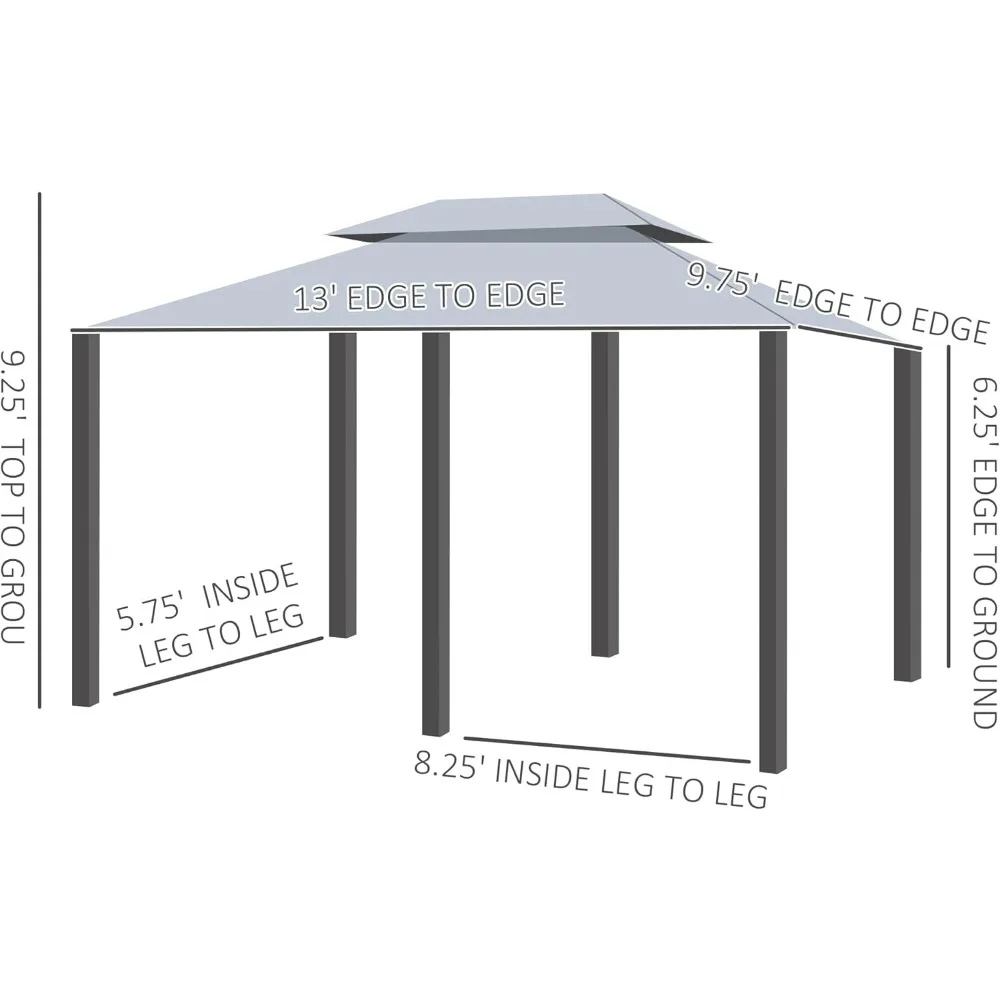 • Wide Canopy Gazebo Information: Overall Dimensions: 9.75' L x 13' W x 8.75' H. Edge Height: 6.5' H. Space Between Columns: 5.73' L x 8.38' W. Includes 12 support stakes for mounting to soft ground. Note: Store away the canopy top during adverse weather or inclement weather conditions which includes rain, snow, sleet and hail as they will add weight that can cause the gazebo to collapse.