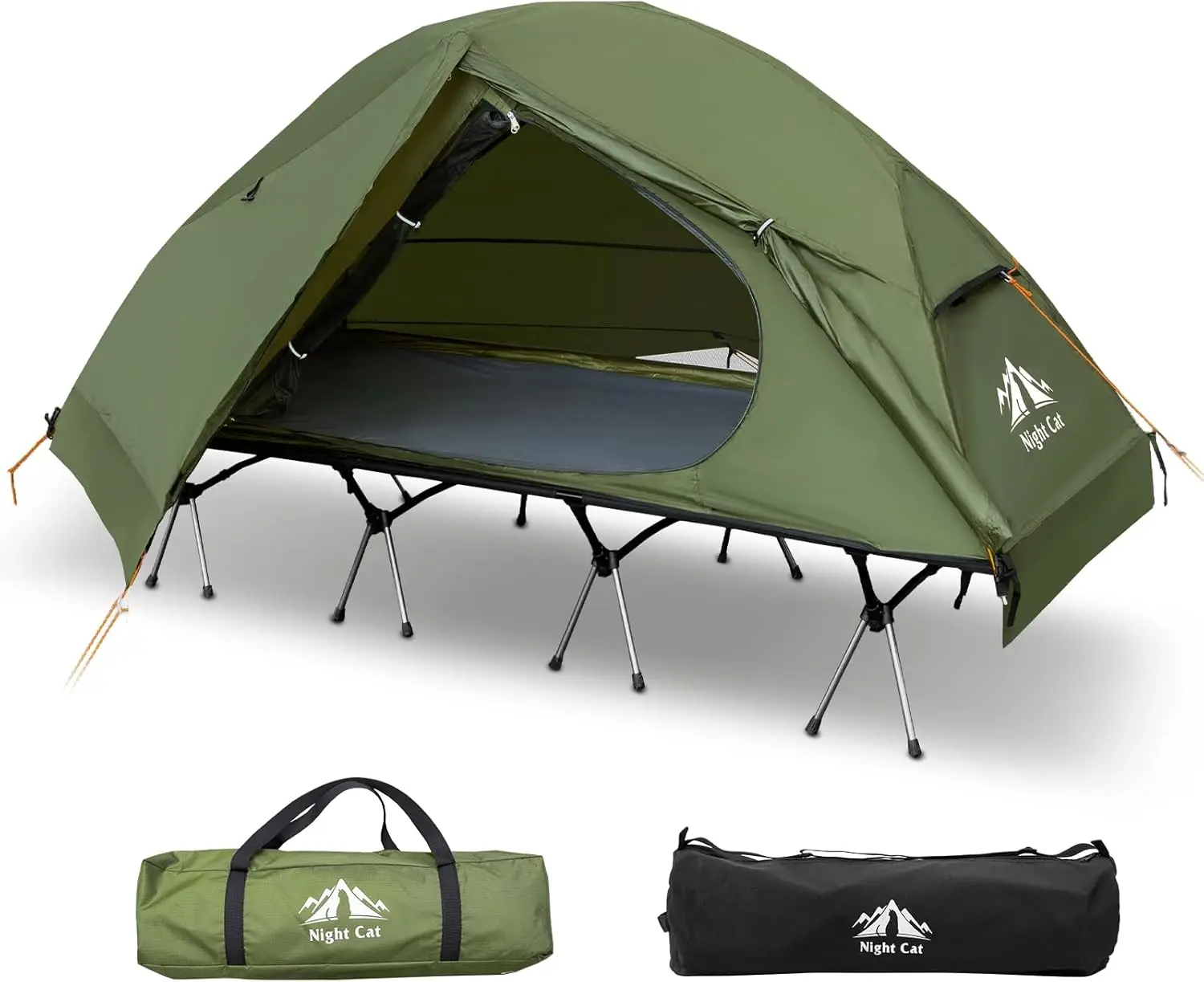 - 【Camping Cot Tent Combo】The package contains 2 items, the black carry bag contains the COT and the green carry bag contains the TENT. Pairing a elevated tent with a camping cot gives you more camping options! The waterproof fabric under the tent ensures a dry and comfortable place. Ripstop nylon fabric for greater durability.