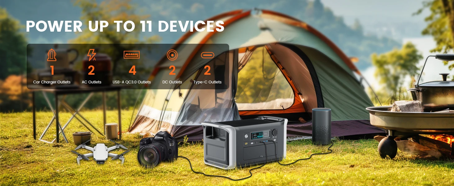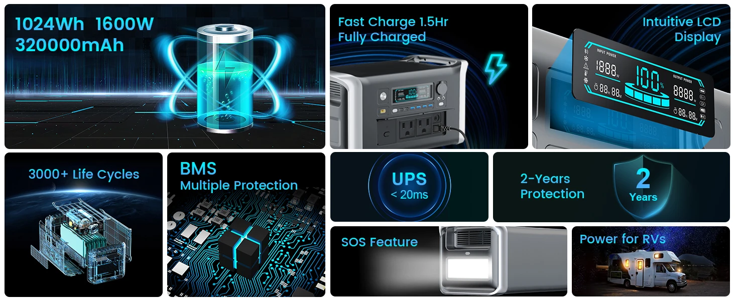 [High Capacity for Multiple Devices]: With a massive 1024Wh capacity, the portable power station can charge up to 11 devices simultaneously, including laptops, phones, and camping lights. Paired with the 200W high-efficiency solar panel, it guarantees a reliable power supply for outdoor adventures or emergencies.