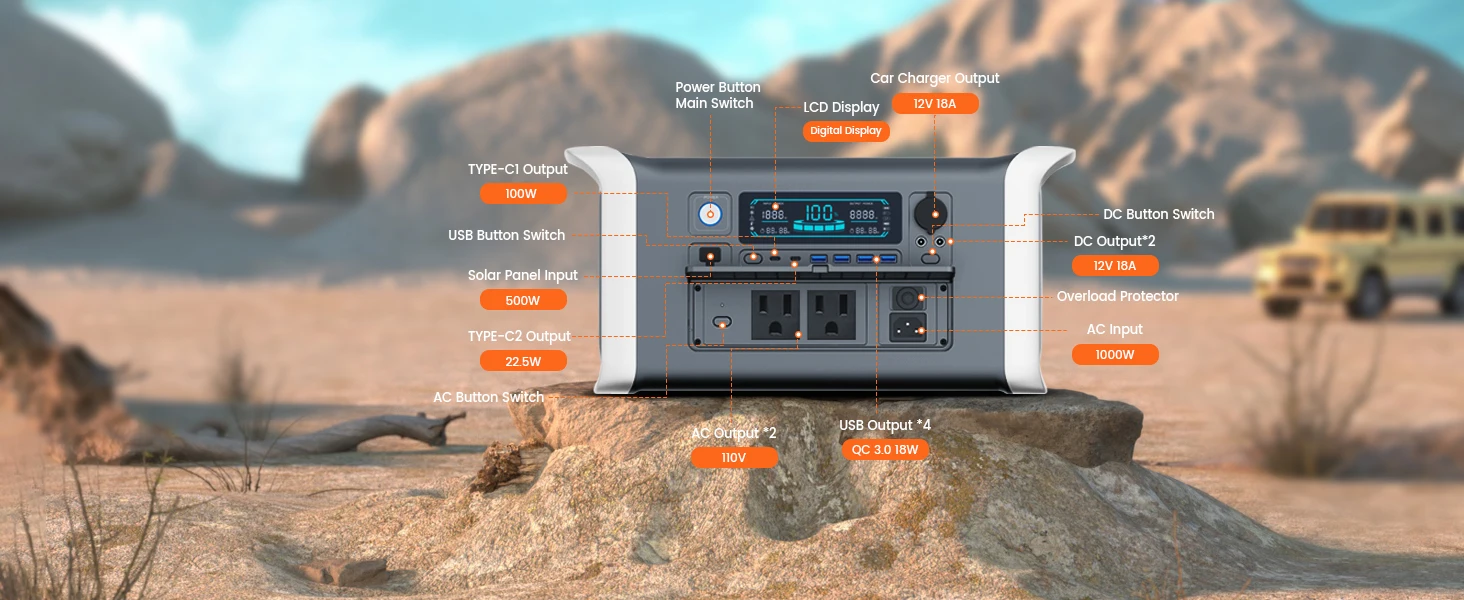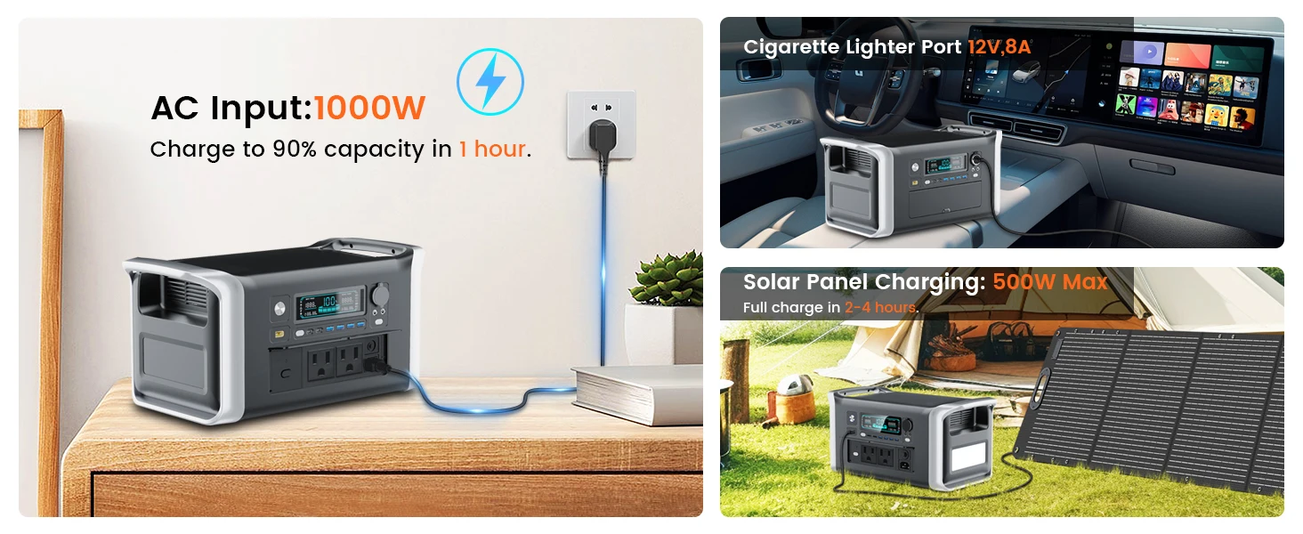 [1.2 Hours Fast Charging]: With 1000W AC input, 90% recharge in 1 hours. Solar charging reaches 100% in 2 hrs at 500W XT60 input. You can also recharge your power station through the car outlet on a road trip. Always ready to go when you need it