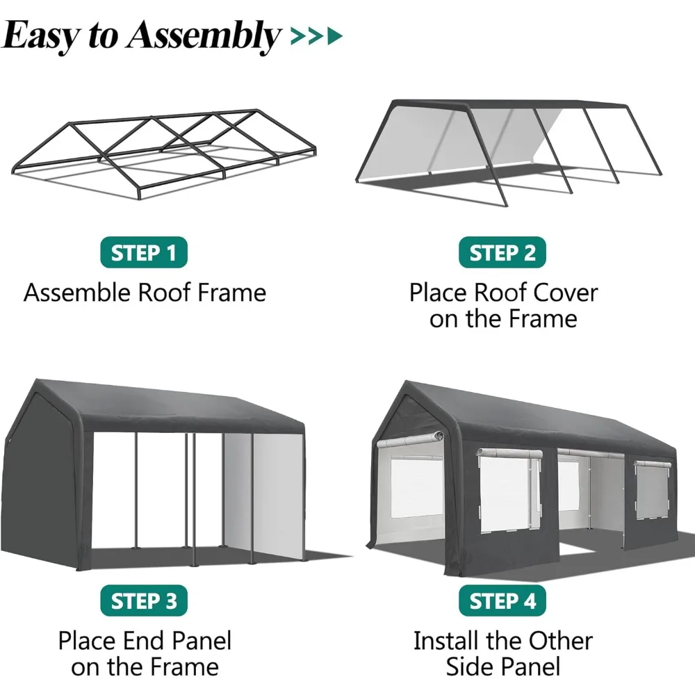 - 🚙170G WATERPROOF CANOPY COVER: Our large Carport is made of waterproof 170g PE tarp with Roll-up Ventilation Windows and 2 Side Doors Design. SIZE: 11.8FT*19.68FT*9.28FT. The outdoor carport storage can hold Car, Boat, Truck, Auto, Motorcycle and so on. It is also suitable for outdoor events like parties, weddings, commercial (Please do not use it when the wind is strong and Please clear the snow promptly)
