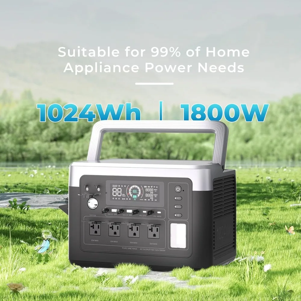 - [Empower Your Home and Adventures] With 1024Wh and 1800W rated power, this device can power 99% of appliances through 11 versatile outlets (4 AC outlets, 2 USB-A quick charge 3.0 ports, 2 USB-C PD ports [20W, 100W], 2 DC outlets, and 1 cigar lighter). It is ideal for outdoor off-grid activities and as home backup power for most appliances, phones, laptops, power tools, cooking utensils, vehicle-mounted products, and remote-controlled aircraft.