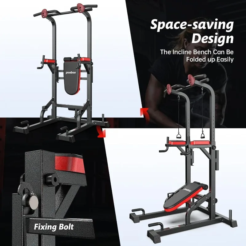 FOLDING INCLINE BENCH - Power tower is equipped with a detachable& incline bench, 24 x 12.5 x 22 inches, which is ergonomically designed. It can be tilted and folded, which makes this product very suitable for small rooms in families and apartments.