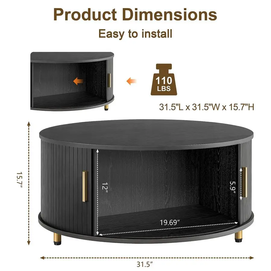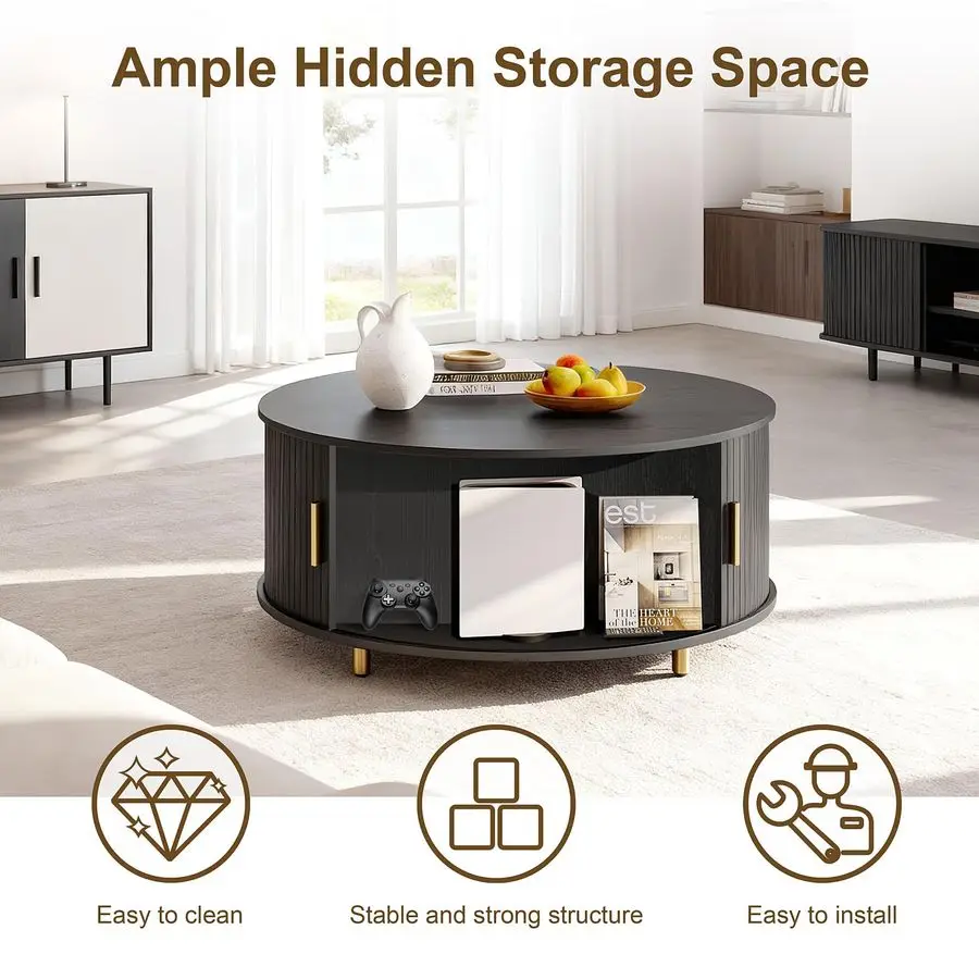 Round Coffee Table, 31.5 Mid Century Modern Coffee Table with 360 Sliding Tambour Door, Fluted Accent Coffee Table with Storage