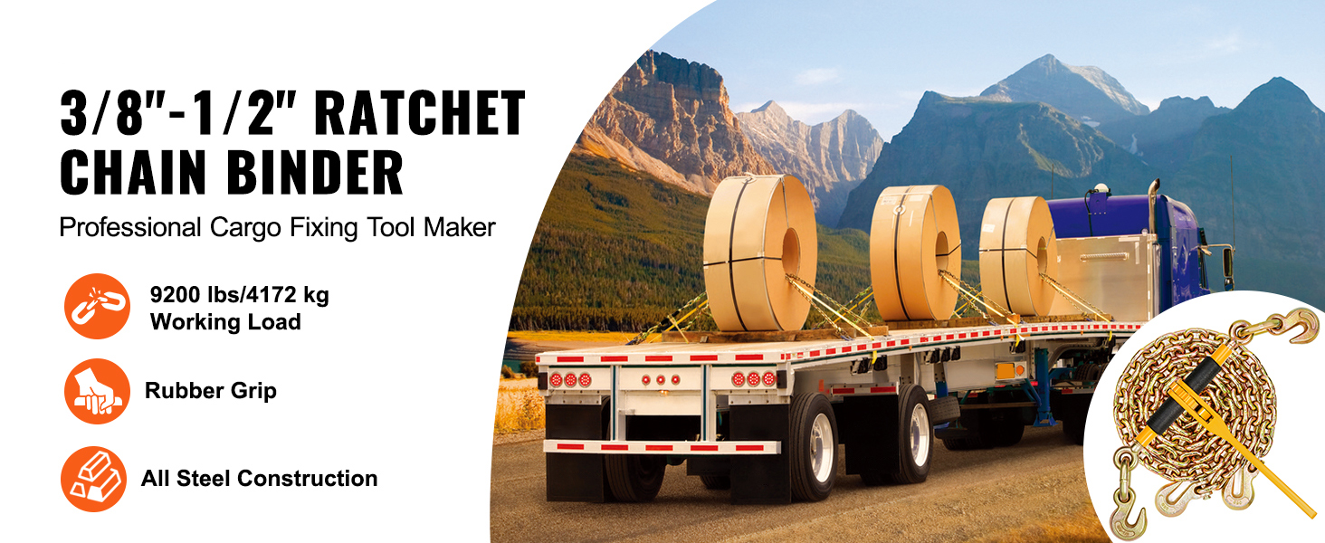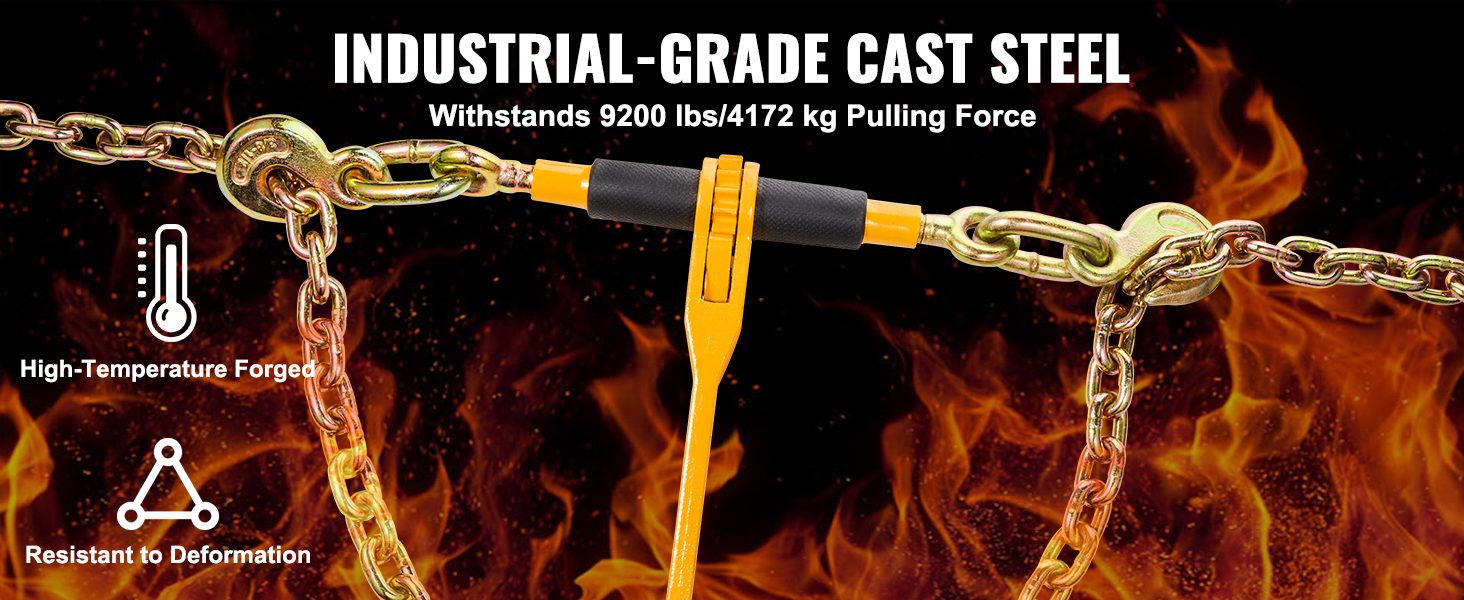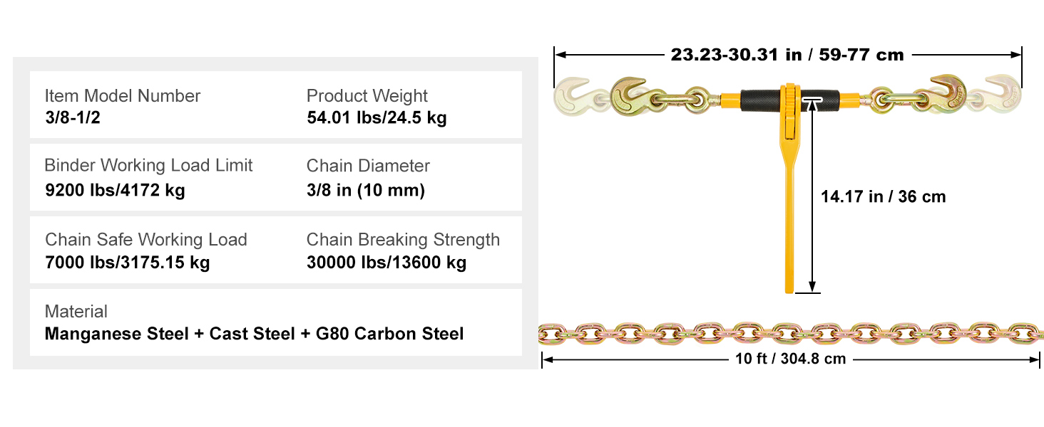 9200 lbs/4172 kg Load Capacity: Made from robust cast steel, this trailer binder is built to handle up to 9200 lbs/4172 kg, offering reliable performance for heavy-duty applications; It features a durable Grade 80 chain with a 3/8" diameter and a length of 10 ft/304.8 cm, providing a breaking strength of 30000 lbs/13600 kg.