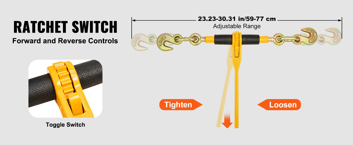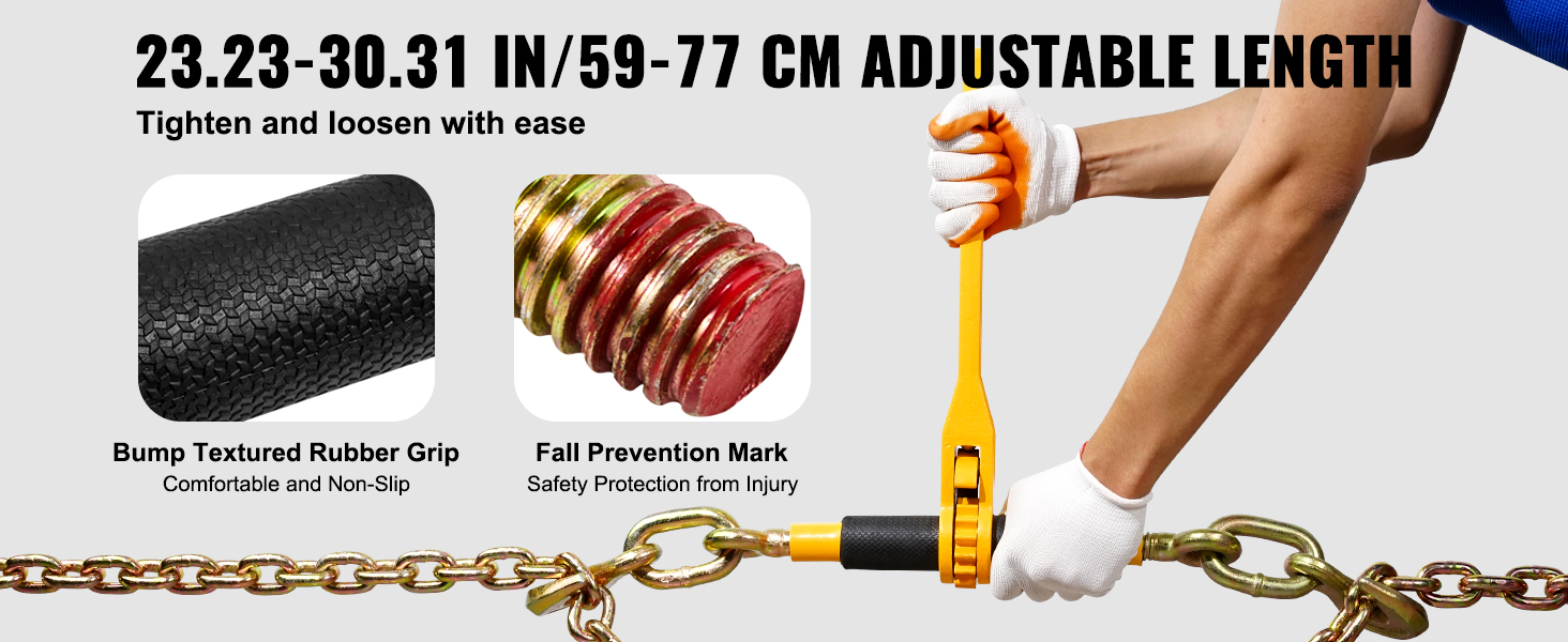 Suitable for 3/8"-1/2" Chains: Designed to accommodate chains ranging from 3/8" to 1/2", this load binder features hooks on both ends to meet various requirements; The distance between the hooks can be manually adjusted from 23.23 to 30.31 inches (59 to 77 cm).